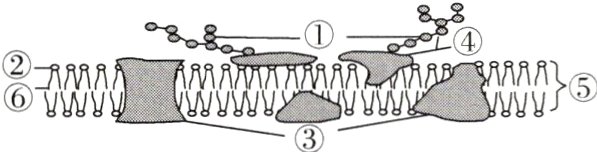 解析:②是磷脂分子的头部,⑥是磷脂分子的尾部,由图中②和⑥组成的磷脂分子,是细胞膜成分中最丰富的脂质,A正确;细胞膜是由双层磷脂分子构成的,提取图中脂质在空气—水界面上铺成单分子层,是该细胞表面积的2倍,B正确;图中③表示蛋白质,蛋白质是生命活动的主要承担者,功能越复杂的细胞膜,蛋白质的种类和数量就越多,C正确;用荧光染料标记的人、鼠细胞膜上的蛋白质分子,融合一段时间后,可见荧光蛋白均匀分布于细胞表面,从而说明膜中的蛋白质能够运动,D错误。