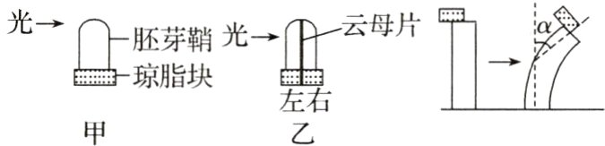 (3)生长素在胚芽鞘顶端能进行横向运输和极性运输。生长素不能透过云母片,乙组中插入云母片导致生长素只能向下运输,左、右两侧琼脂块中生长素含量几乎相等,约是甲组琼脂块中生长素含量的一半。乙组左、右两侧琼脂块中生长素的促进作用大体相等,所引起的α角基本相同;甲组琼脂块中生长素对胚芽鞘生长的促进作用大于乙组中左、右两侧琼脂块中生长素的促进作用,所引起的α角大于乙组中左、右两侧琼脂块所引起的α角。