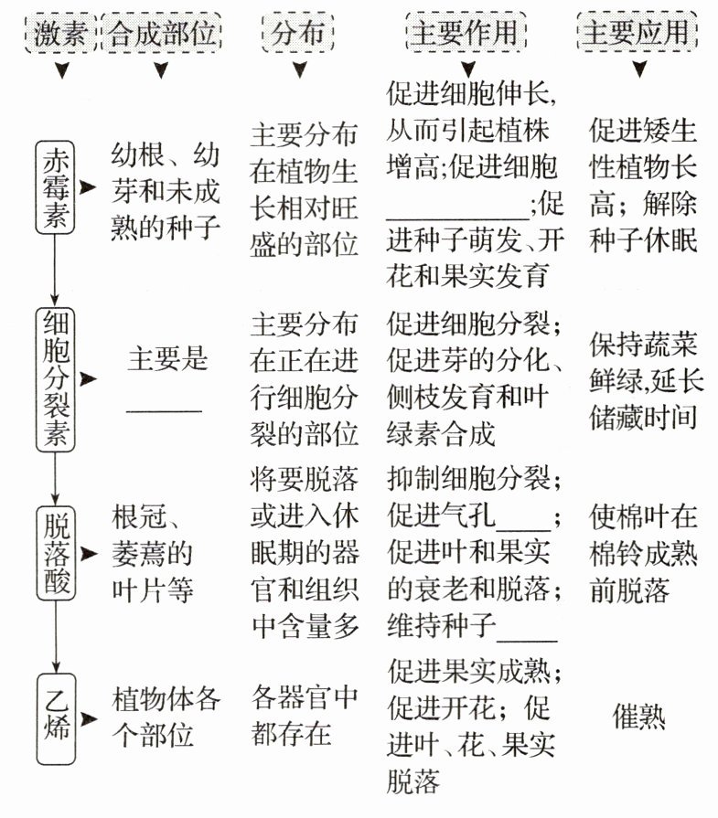 解析:赤霉素能促进细胞分裂与分化,细胞分裂素主要由根尖合成,脱落酸能促进气孔关闭和维持种子休眠。
