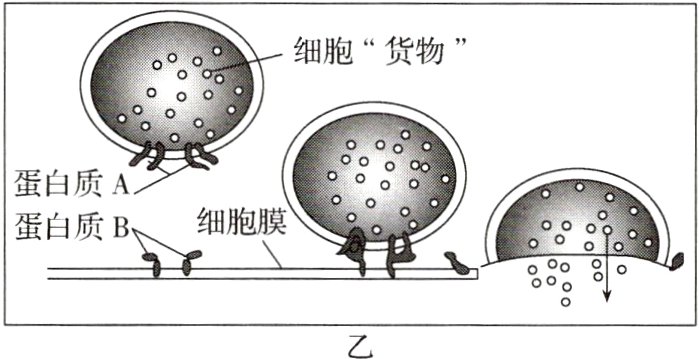 (2)图乙中的囊泡能够精确地将细胞“货物”运送到相应位置并分泌到细胞外,据图推测可能的原因是什么?此过程体现了生物膜具有什么功能?