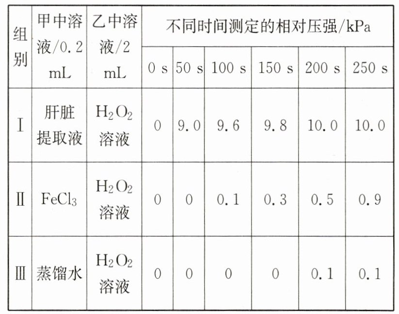 C H₂O₂分解产物是H₂O和O₂,其中O₂会导致压强改变,A正确;据表分析可知,甲中溶液为酶、无机催化剂或蒸馏水,乙中溶液是反应物,应从甲中溶液与乙中溶液混合时开始计时,B正确;三组实验中的H₂O₂溶液均为2mL,则最终产生的相对压强应相同,据表可知,250s之前(200s)Ⅰ组反应已结束,但Ⅱ组和Ⅲ组压强均未达到Ⅰ组的终止压强10.0kPa,故250s时Ⅱ组和Ⅲ组反应仍在进行,C错误;酶的高效性是指与无机催化剂相比,酶降低化学反应活化能的作用更显著,对比Ⅰ、Ⅱ组可知,在相同时间内Ⅰ组(含过氧化氢酶)相对压强变化更快,说明酶的催化作用具有高效性,D正确。