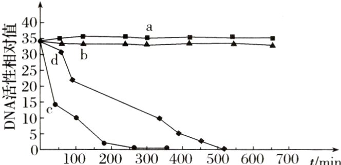 超氧化物歧化酶(SOD)能消除生物体在新陈代谢过程中产生的有害物质,具有抗衰老的特殊效果,其含有的金属离子对增强酶的热稳定性有重要影响。资料报道,当反应温度为88℃,时间为15~30 min时对SOD的活性影响不大。下面是通过光催化反应装置分别在四种条件下检测紫外光对DNA损伤的相关曲线(TiO₂表示二氧化钛,是一种光催化剂;UV表示紫外光)。Ⅰ组:黑暗处理曲线a(TiO₂/DNA体系)、Ⅱ组:紫外光处理曲线b(UV/DNA体系)、Ⅲ组:光催化曲线c(UV/TiO₂/DNA体系)、Ⅳ组:光催化引入SOD曲线d(UV/TiO₂/SOD/DNA体系)。据图回答下列问题。
