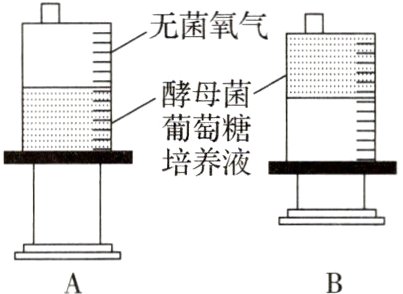 某实验小组为探究酵母菌的呼吸方式,做了以下两组实验:用注射器A缓慢吸入25 mL酵母菌葡萄糖培养液,倒置,排尽注射器中的气体,再吸入25 mL无菌氧气,密封;用注射器B缓慢吸入25 mL酵母菌葡萄糖溶液,倒置,排尽注射器中的气体,密封。将两注射器置于25℃的水浴锅中保温一段时间,据图分析以下说法错误的是( )