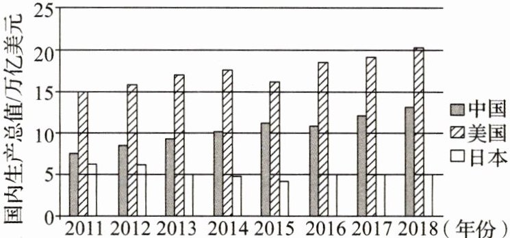 材料二 2011年至2018年中美日国内生产总值柱状图