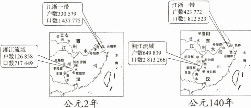 (2023.全国甲卷.T25)在中国古代,自然环境、社会生产状况、国家政策、灾害以及战乱,都会对人口的区域布局产生影响。如图显示了两汉间江浙一带与湘江流域人口增长的巨大差异,能够解释这种差异的主要因素是( )