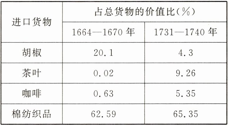 表1是学者统计的17 - 18世纪英国东印度公司进口的部分亚洲货物价值占比。据表可知,该时期 ( )