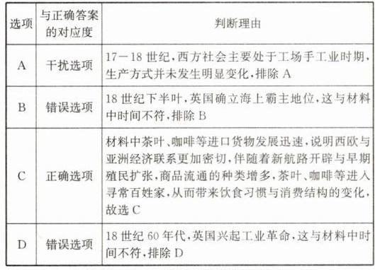 C 据材料可知,随着新航路的开辟,可可树被广泛引种,而后在工业革命的推动下,世界市场逐渐形成,可可豆由奢侈品逐渐成为大众化商品,综上可知,可可豆商品化的过程与欧洲资本主义发展密切相关。新航路开辟促进物种交流是一方面原因,但非根本原因,排除A;新航路开辟后,世界贸易中心由地中海沿岸转移到大西洋沿岸,欧洲商业格局发生变化,与材料信息中的变化关系不大,排除B;19世纪末20世纪初,世界殖民体系初步形成,与材料中时间不符,排除D。