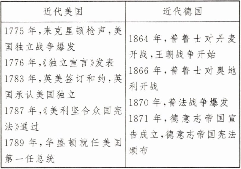 (2)美国通过反对英国殖民统治的独立战争,赢得了民族独立,建立近代国家;德国通过王朝战争,完成国家统一,形成近代国家。