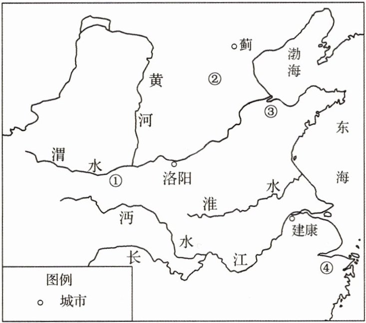 D 汉代经济重心在北方,南方地广人稀,到了南北朝时期,随着北民大量南迁,带去了先进的生产工具和技术,充实了劳动力资源,江南地区逐渐发展成为“民多田少”,④位于江南,故选D项;①、②、③均位于北方,与“地广人稀”不符,排除A、B、C项。