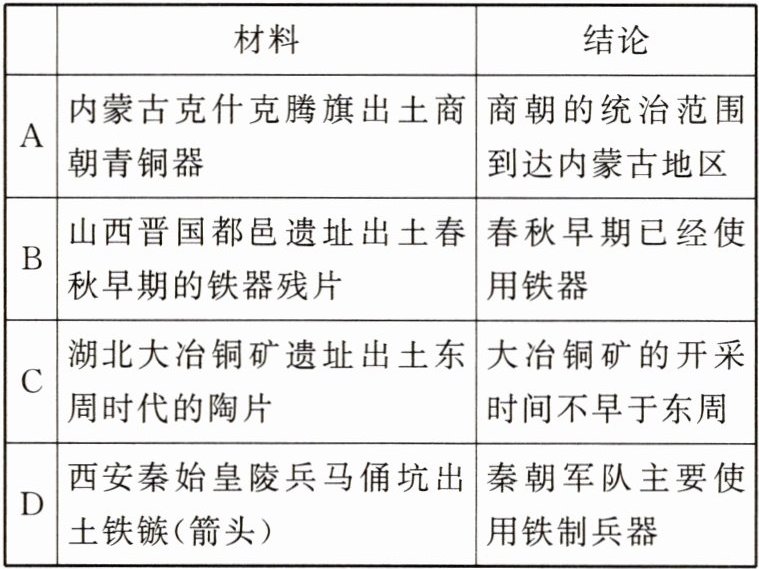 B 材料“山西晋国都邑遗址出土春秋早期的铁器残片”,说明在春秋早期晋国已经开始使用铁器,材料与结论之间能够形成较完整的逻辑关系,B正确;依据所学可知,内蒙古出现的个别商朝青铜器不能证明商的统治范围到达内蒙古地区,排除A;材料“湖北大冶铜矿遗址出土东周时代的陶片”,说明当时已经出现了冶铜业,大冶铜矿的开采时间不晚于东周,排除C;秦始皇陵兵马俑坑出土铁铍(箭头)说明秦朝军队使用铁制兵器,但不能说明“主要使用”,排除D。