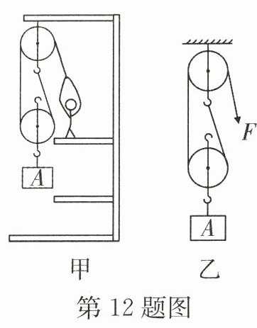 12. 俊星家周末乔迁新居,因家中柜子搬运不方便,所以俊星提出利用滑轮组来完成,其设计方案如图甲所示. 图乙为滑轮组的连接方式,已知柜子A的重力为740 N,动滑轮的重力为60 N,柜子匀速下降的竖直高度为6 m,下降过程用时1 min(不计绳重与摩擦). 俊星对此工作过程及装置作出以下判断,其中正确的是 ( )