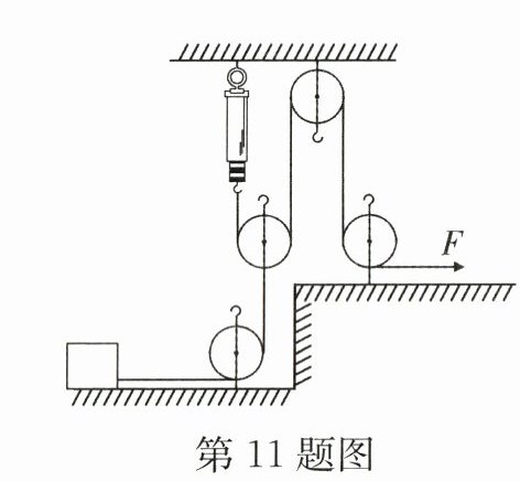 11. (2022·抚顺中考)使用如图所示的滑轮组,沿水平方向匀速拉动质量为300 kg的物体,弹簧测力计的示数为200 N,物体在10 s内移动了1 m. 物体所受的摩擦力为物重的0.1倍. 不计绳重和滑轮组内的摩擦,下列说法正确的是(g取10 N/kg) ( )