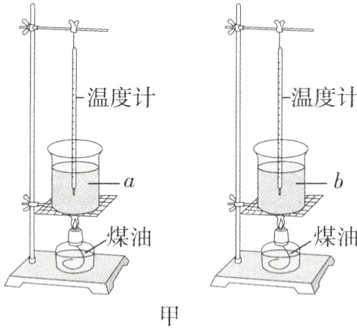 10.(2022·合肥蜀山月考)用相同的酒精灯分别对a、b两液体加热(如图甲),根据测得数据分别描绘出两液体的温度随加热时间变化的图象(如图乙),若不计液体热量散失,分别用$m_a$、$m_b$、$c_a$、$c_b$表示a、b两液体的质量和比热容,则结合图中信息作出的下列推断正确的是( )