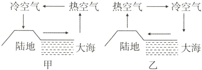 14. 在沿海地区炎热的天气里,由于陆地与海水的比热容不同,易形成海陆风. 白天,陆地比大海升温________(选填“快”或“慢”),地面与海面上空的空气发生对流,形成风,如图________(选填“甲”或“乙”)所示.