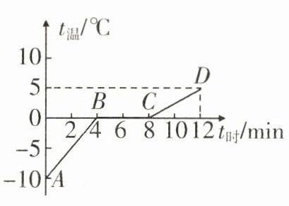 小于 2 [解析]晶体熔化过程要吸收热量,内能增大,所以第6min时的内能小于第8min时的内能;根据图中坐标信息可知,该物质在AB段温度升高10℃,被加热4min;在CD段温度升高5℃,被加热4min,则该物质在AB段吸收的热量与CD段吸收的热量之比为1∶1,根据Q = cmΔt可得,$\frac{c_{1}}{c_{2}}=\frac{Q_{1}}{Q_{2}}×\frac{m\Delta t_{2}}{m\Delta t_{1}}=\frac{\Delta t_{2}}{\Delta t_{1}}=\frac{5℃}{10℃}=\frac{1}{2}$,所以该物质在CD段的比热容是AB段的比热容的2倍.