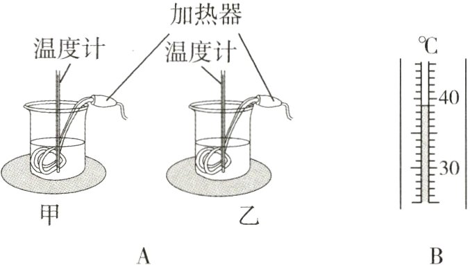 16. 在“探究不同物质的温度变化与吸热关系”的实验中,取质量和初温都相同的甲、乙两种液体,分别装入相同的烧杯中,用相同的加热器加热,如图A所示.