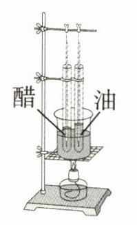 15. 小智学习了比热容的知识后,想知道家里的陈醋和大豆色拉油哪个吸热能力强. 他把质量和初温都相同的醋和油,装入相同的试管,放入沸水中加热,如图所示.