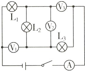 (1)由电路图可知,三个灯泡串联,电压表V₁测L₁、L₂两端电压之和,电压表V₂测L₂两端的电压,电压表V₃测L₂、L₃两端电压之和,由串联电路的电压特点知,$U₂ = U_{V2} = 2V ①,$$U_{V1} = U₁ + U₂ = 5V ②,$由①②可得L₁两端的电压$U₁ = 3V.(2)U_{V3} = U₂ + U₃ = 8V ③,$由①③可得U₃ = 6V,所以电源电压U = U₁ + U₂ + U₃ = 3V + 2V + 6V = 11V.