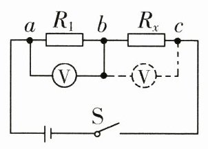 $\frac{U_2R_1}{U_1}$ $U_1 + U_2$ [解析]当将电压表接在$a$、$b$两端时,电压表的示数为$U_1$,因串联电路中各处的电流相等,所以,电路中的电流$I=\frac{U_1}{R_1}$,当电压表接在$b$、$c$两端时,电压表的示数为$U_2$,则电阻$R_x$的阻值$R_x=\frac{U_2}{I}=\frac{U_2}{\frac{U_1}{R_1}}=\frac{U_2R_1}{U_1}$,因串联电路中总电压等于各分电压之和,所以,电源电压$U = U_1 + U_2$.