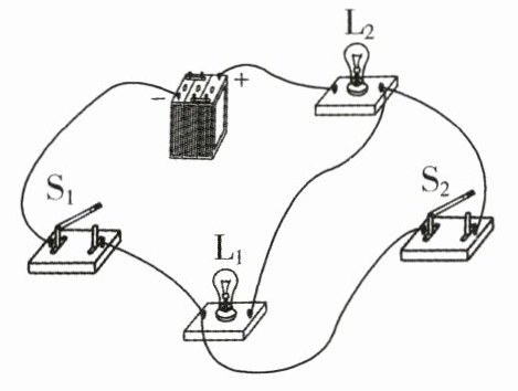 7. (2022·自贡中考)小谢在做实验时,先连成如图所示的电路,闭合开关S₁并观察灯泡亮暗情况后,再闭合开关S₂,小谢看到的现象是 ( )