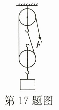 17. 用如图所示的滑轮组将重 85 N 的物体匀速提升 2 m,拉力$F$为 50 N. 此过程中拉力做的有用功为_______ J,总功为_______ J,滑轮组的机械效率为_______. 根据已知条件,以下四个物理量:①动滑轮上升的高度、②动滑轮的重力、③额外功、④拉力的功率,还能求出的有_______和_______(后两空均填序号).