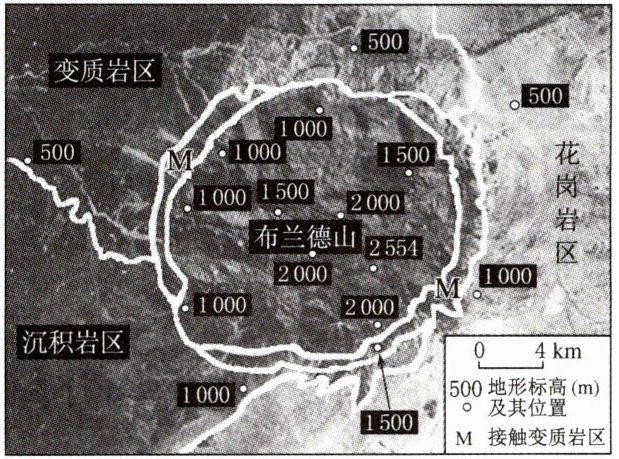 。下图为布兰德山及周边区域地质地貌遥感影像图。据此完成(1)~(3)题。(1)布兰德山花岗岩岩体的成因是(