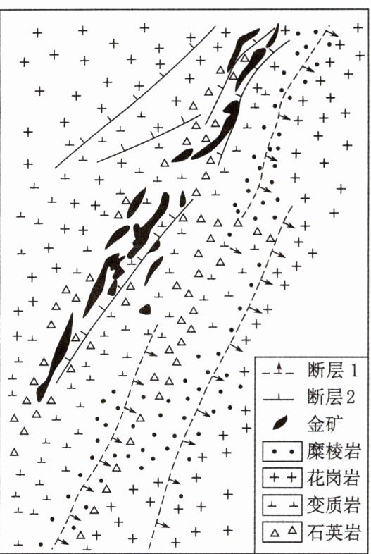 (2023·重庆模拟)糜棱岩是强烈破碎塑变作用所形成的岩石,往往分布在断裂带两侧,由于压扭应力的作用,岩石发生错动,研磨粉碎,并由于强烈的塑性变形,细小的碎粒处在塑性流变状态下而呈定向排列,糜棱岩的分布往往对金、银矿床的形成有一定指示作用。下图示意我国河北某金矿区岩石分布状况。图中断层1形成时间为太古宙,断层2形成时间为晚三叠世——侏罗纪。研究发现:金矿是断层2断裂形成过程中产生的。据此完成3~5题。