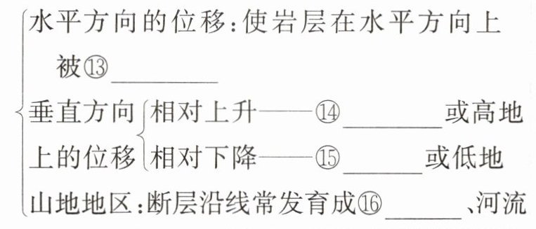 (1) 含义:地壳运动产生的强大压力和张力,超出了岩层的承受程度时,岩层发生断裂,并沿⑪发生明显⑫而形成。