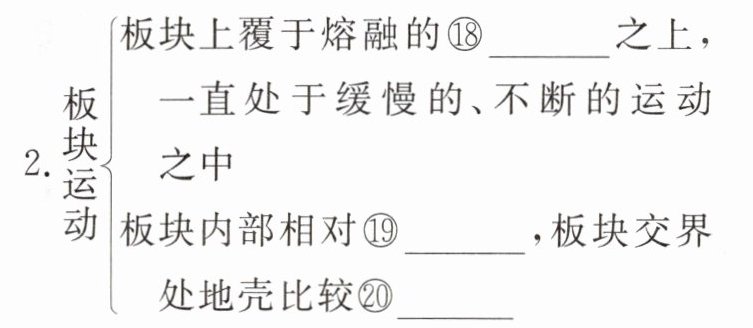 1. 板块:板块构造学说认为,地球⑰是刚性的,破碎成为多个不规则的块体。