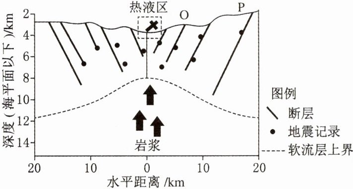 1.D 解析 由材料结合图示可知,地幔的岩浆在大洋中脊处上升,快速冷却形成新的大洋地壳。作为板块运动的一部分,在大洋中脊形成的大洋地壳在接近俯冲板块边界的过程中逐渐变冷变重,最终俯冲进入地幔,形成一个大洋地壳的循环。由此可推断,大洋中脊处两侧地壳向外张裂扩张,为生长边界,A项错误,D项正确;热液区岩石多为喷出型岩浆岩(玄武岩),在远离大洋中脊的地方,大洋地壳逐渐变冷变重,俯冲板块边界俯冲入地幔,B、C两项错误。故选D。2.B 解析 从上题可以得出,大洋中脊处地壳向外扩张。结合文字材料对大洋地壳循环的描述可推测,大洋中脊处形成的岩石最新,越往两侧,岩石越老,最终在海沟处消失,形成大洋地壳循环。所以图中从O到P岩石的新老关系表现为由新到老,B项正确,A、C、D三项错误。故选B。