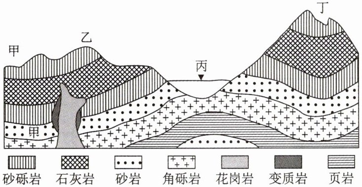 3.C 解析 由图可知,丙处河床所在的岩层是角砾岩和砂岩,岩层向上拱起是背斜,背斜顶部受张力,岩层破碎,易受外力侵蚀成谷地,A项错误,C项正确;角砾岩和砂岩可溶性弱,流水溶蚀作用弱,B项错误;图中岩层没有发生断裂,D项错误。故选C。4.C 解析 甲、乙、丙、丁四地中能看到完整的沉积岩岩层形态的是角砾岩,角砾岩形成后应呈水平状,现丙处角砾岩层的海拔最高,说明丙处沉积岩地层抬升幅度最大,C项正确,A、B、D三项错误。故选C。