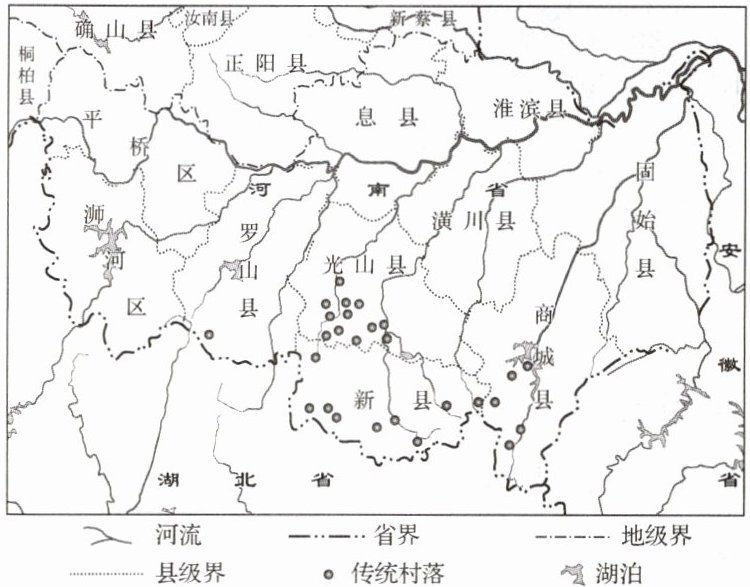 5.A 解析 读图可知,豫南传统村落主要沿河流分布,A项正确;传统村落主要分布在山区,B项错误;传统村落沿河流分布,河流分布于山谷,因此山谷多于山脊,C项错误;光山县分布最多,D项错误。故选A。6.D 解析 由材料可知,豫南地处大别山区,地形起伏多变,地形类型复杂,村落主体沿着山水体势进行纵向或横向排列,因此产生多种不同的空间形态,D项正确;文化多元会影响建筑物的风格,但是该地村落的形态主要受地形、地势条件影响,A项错误;该地地处山区,排水速度较快,洪涝灾害较少发生,B项错误;气候相对稳定,没有多变,该区域空间尺度较小,气候差异不大,C项错误。综上所述,故选D。