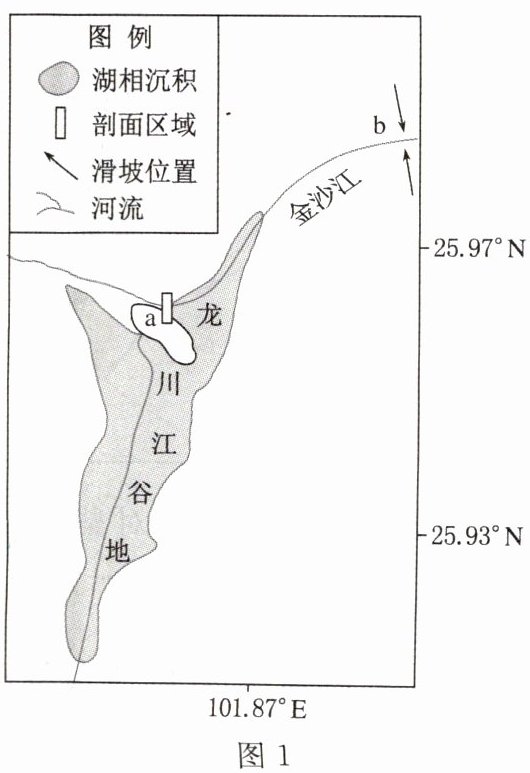 (2023·海南中学二模)金沙江谷地b处曾多次发生较大规模的山体滑坡,形成堰塞坝体,并在其上游龙川江谷地形成湖泊。后因湖水外泄,湖泊逐渐消失。图1为龙川江谷地及其附近地形水系图,图2为图1中a处河流阶地示意图,T1、T2为不同的河流阶地,这两个阶地深度(某阶地底部到上一阶地底部的垂直距离)差异较大。据此完成1~3题。