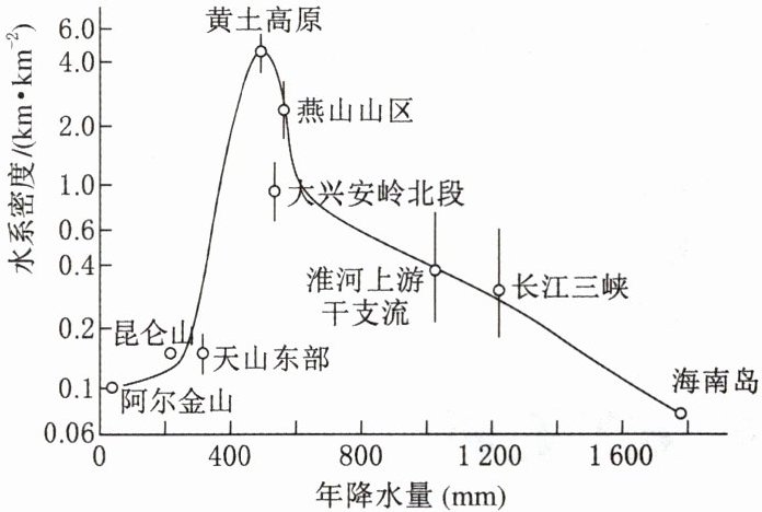 (2023·湖北模拟)水系密度又称河网密度,指流域内总河长与流域面积之比,常随气候、地质、地貌等条件变化而变化。如图示意我国部分区域水系密度与年降水量的关系(线段长度表示变幅)。据此完成1~3题。