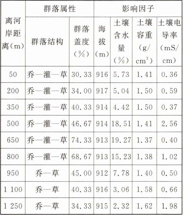 ①。下表反映该植物群落属性及影响因子随离河岸距离增加的变化情况(其