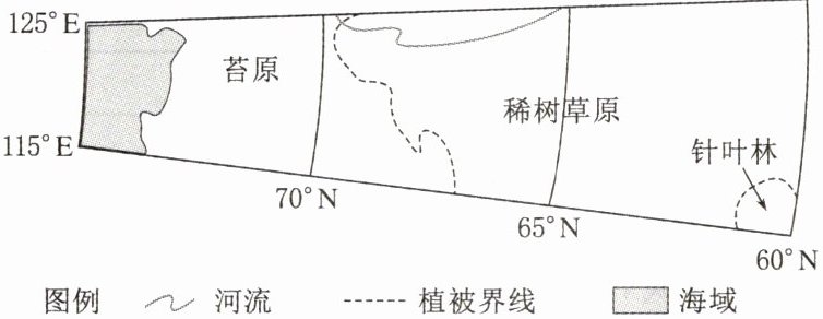 1.A 解析 读图可知,针叶林、稀树草原、苔原的分布表现为纬度之间的差异,主要是由热量条件导致的,A项正确;水分导致经度地带分异规律,B项错误;地形导致的海拔不同,形成了垂直地带分异规律,D项错误;土壤对植被分布的影响较小,C项错误。故选A。2.D 解析 读图可知,稀树草原区域纬度高,热量条件差,土壤中微生物活动较弱,地表风化壳厚度较小,木质大藤本和附生植物少,A、B两项错误,D项正确;热带稀树草原地区的树木干粗大两端较小,C项错误。故选D。