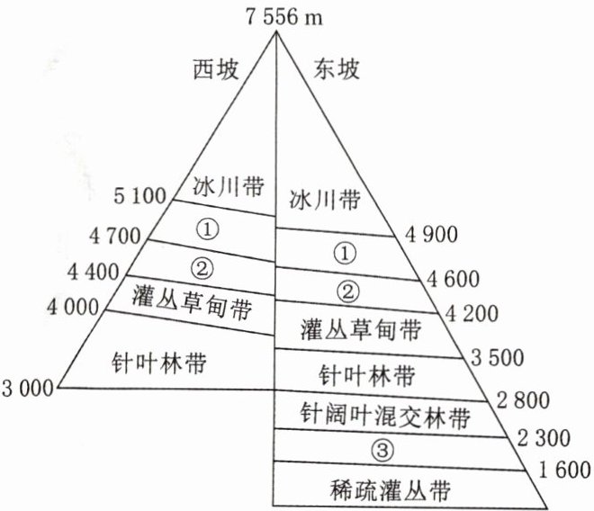 (2023·江苏模拟)贡嘎山位于川西横断山区,因东西坡降水差异,两坡针叶林种群有较大差异。下图为贡嘎山垂直自然带分布示意图。据此完成1~3题。