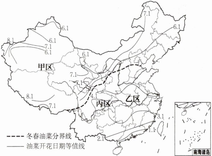 4.C 解析 甲区所属的地理纬度较高,开花时间较迟,应该是春油菜产区。甲区深居内陆,降水稀少,光照充足,但水资源短缺,且与水质无关,C项正确,A、B、D三项错误。故选C。5.B 解析 丙地等值线向北凸出,说明油菜开花日期较同纬度其他地区早;位置上看该地位于四川盆地,周围被高大山脉围绕,受冷空气影响小,导致气温偏高,开花比同纬度要早,B项正确;与水分、热量、人类活动无关,A、C、D三项错误。故选B。