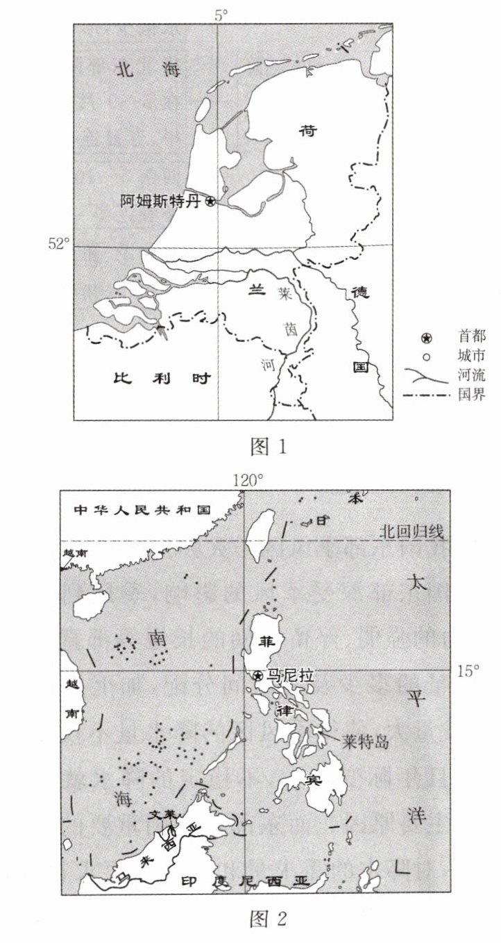 (2)从地理位置角度分别说明荷兰常受风暴潮影响、菲律宾常受台风影响的原因。