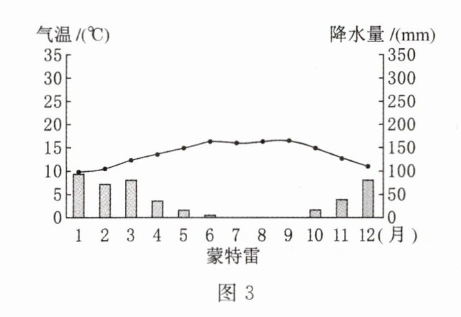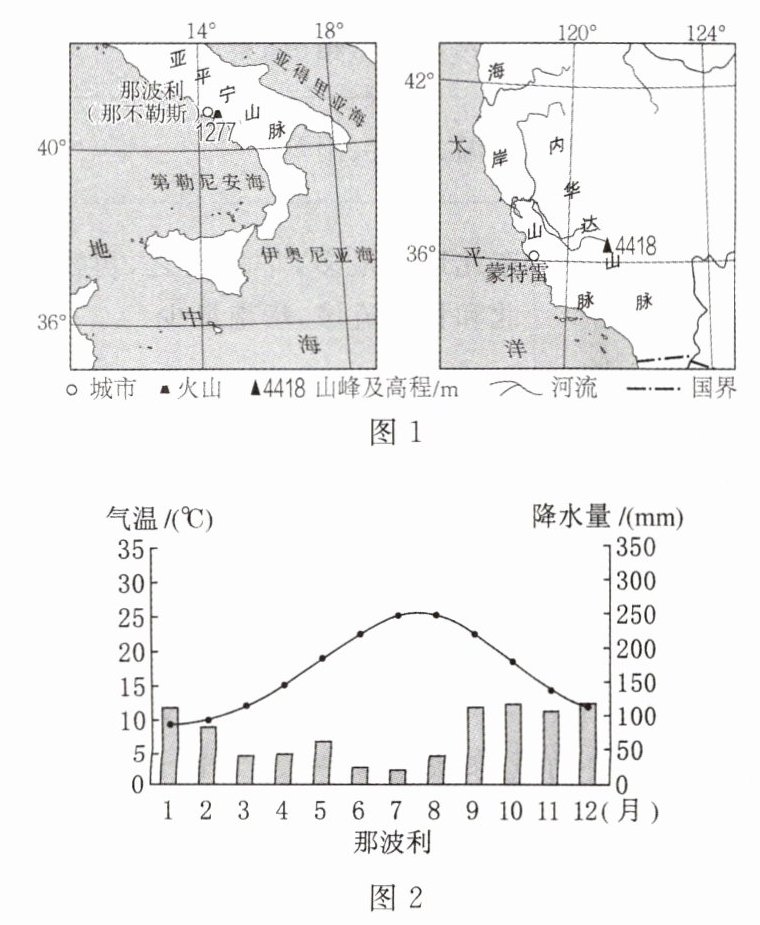 图1为意大利那波利和美国蒙特雷的地理位置。图2、图3为意大利那波利和美国蒙特雷的气候资料。