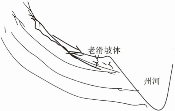 (2023·福建模拟)变倾角岩层是指倾角(地质构造面上的倾斜线和水平面的夹角)随坡位(坡面所处的地貌部位)发生变化的岩层。下图示意四川达州市州河西岸上陡下缓的变倾角岩层剖面,该地的老滑坡体发生了二次滑塌。据此完成3~4题。