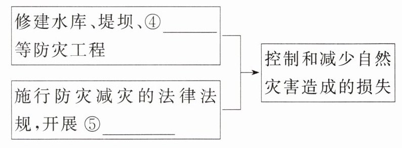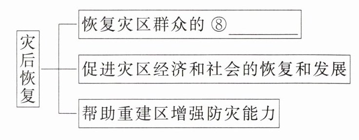 ①防 ②人造卫星 ③动态监测 ④防护林 ⑤减灾教育 ⑥物资 ⑦伤员