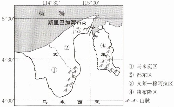 文莱位于加里曼丹岛北部,被马来西亚的沙捞越州分隔为不相连的东西两部分,东部地势较高,西部多沼泽,首都斯里巴加湾系文莱最大城市。文莱森林茂密,覆盖率72.11%,沿海石油资源丰富。全国共有四个行政区。下图为文莱四个行政区分布图。据此完成3~5题。