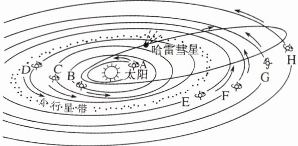 【提醒】(1) 彗星绕日公转的轨道呈扁长的椭圆形,公转的方向是自东向西,呈顺时针方向;彗星的彗尾总是背向太阳,离太阳越近,彗尾越长,反之越短。
