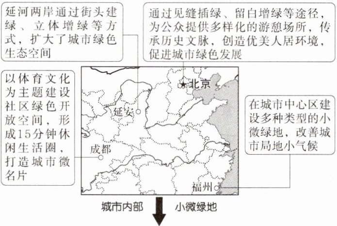 【例3】 (2023·北京卷)小微绿地是斑块状散布在城市内部的开放空间。下图示意我国不同区域小微绿地的探索和实践。读图,回答下列问题。