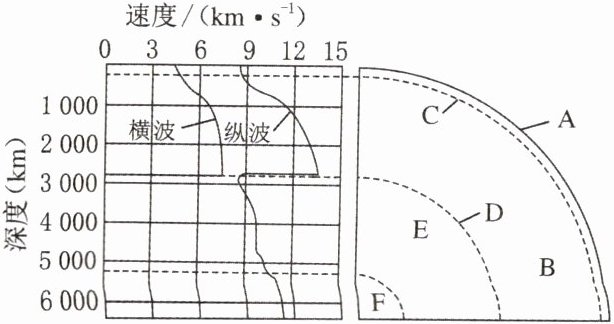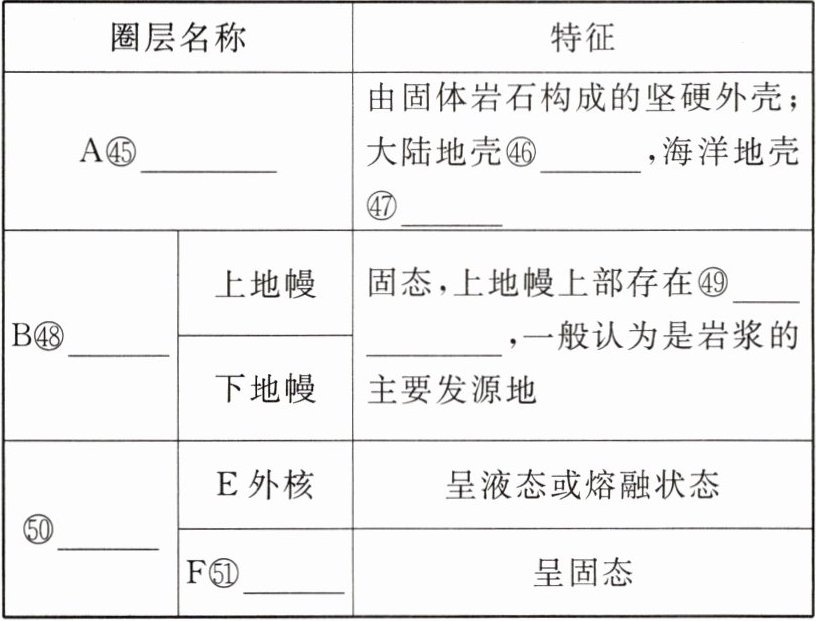 ㊸地震波传播速度 ㊹莫霍界面 ㊺地壳 ㊻厚 ㊼薄 ㊽地幔 ㊾软流层 ㊿地核 51内核 52大气圈 53液态水 54生物圈