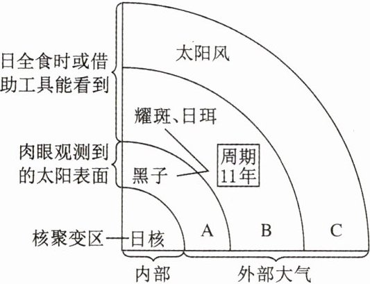 层。b. 太阳活动的主要类型:A层的黑子,B层的耀斑,其周期约为㉒