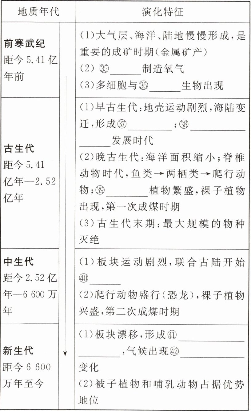 ㉖时间顺序 ㉗层理构造 ㉘下 ㉙上 ㉚化石 ㉛低等 ㉜高等 ㉝地层顺序 ㉞地质年代表 ㉟蓝细菌 ㊱真核 ㊲联合古陆 ㊳海洋无脊椎动物 ㊴蕨类 ㊵解体 ㊶现代海陆分布格局 ㊷冷暖交替