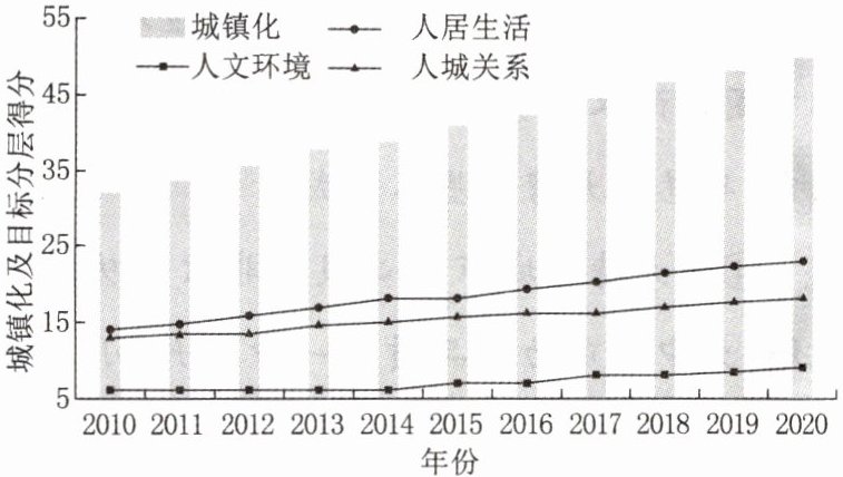 (1)读图可知,2010—2020年期间,中国城镇化率在逐步提升,目标分层得分由原来的30%不到提升至45%以上;人居生活、人文环境及人城关系也得到了显著提升;同时城镇化评价指标体系项目逐渐细化,由原来的单一城镇化率增加了多个项目,囊括的项目也在增多。