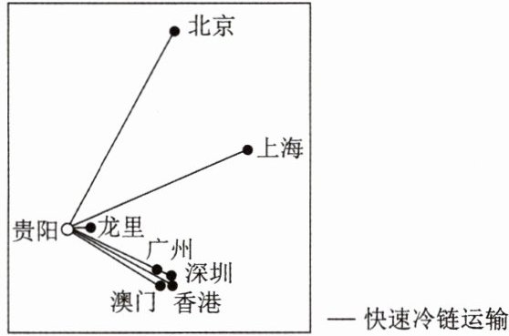 【例1】(2023·全国乙卷)豌豆尖是冬季时令蔬菜。贵州龙里豌豆尖生产历史长、品质优,然而售价低,主要供应周边市场。2016年,龙里豌豆尖被认证为国家地理标志保护产品。近年来,通过与蔬菜经销商合作,利用快速冷链运输,龙里豌豆尖以较高价格畅销少数城市(如图)。据此完成(1)~(2)题。